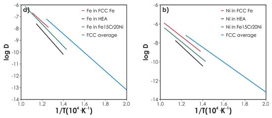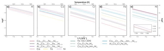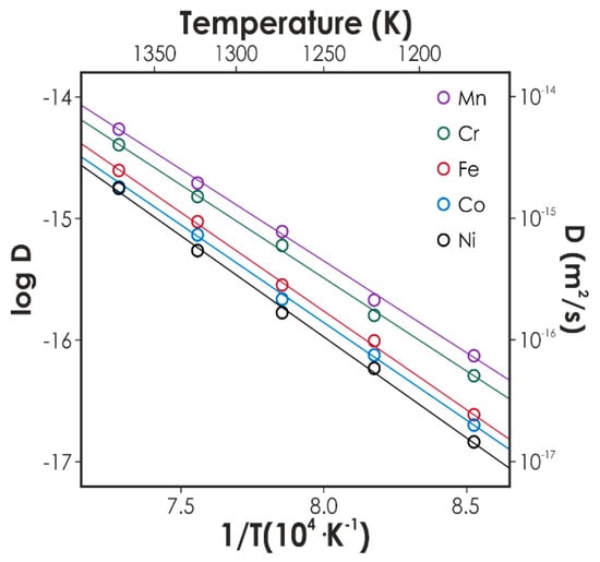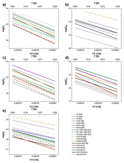 In Figure 1, the obtained tracer values of diffusion coefficients are presented with the use of the Arrhenius plot. The determined sequence of decreasing diffusion rate was as follows: , similar to the one observed in conventional alloys [].
