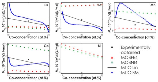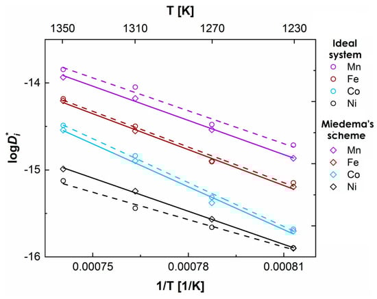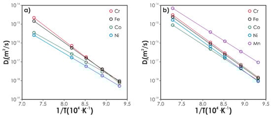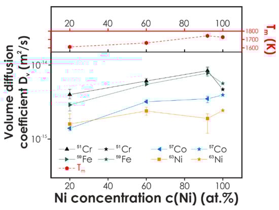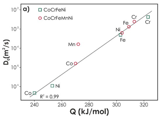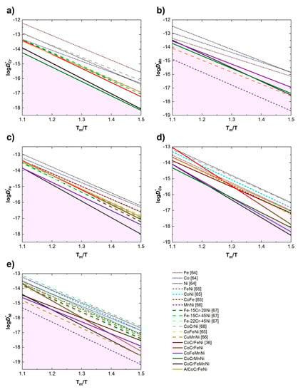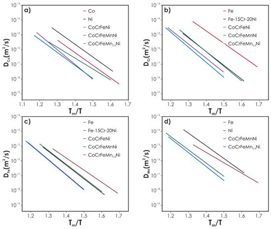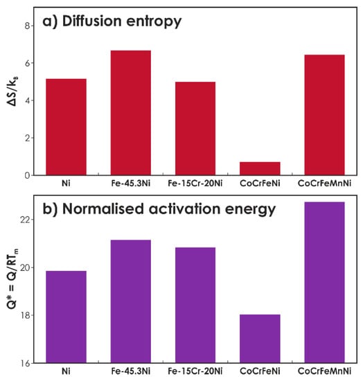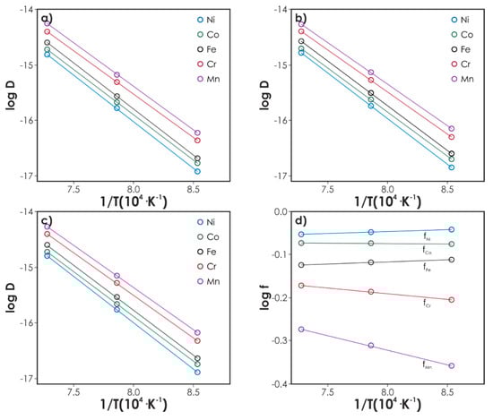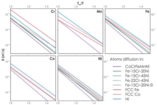 As can be seen, when the absolute temperature was considered, no correlation between the number of components and the rate of diffusion was found. Also, it is worth noting that systems Mn-containing alloys exhibited relatively high diffusivities, which supports the findings of Vaidya et al. []. For the normalized temperature, there was also no correlation between the number of components and values of Ni tracer diffusion coefficients, which puts into question the findings of previous authors []. Similar calculations were also carried out, with comparable results, for tracer diffusivities of Co and Fe Figure.