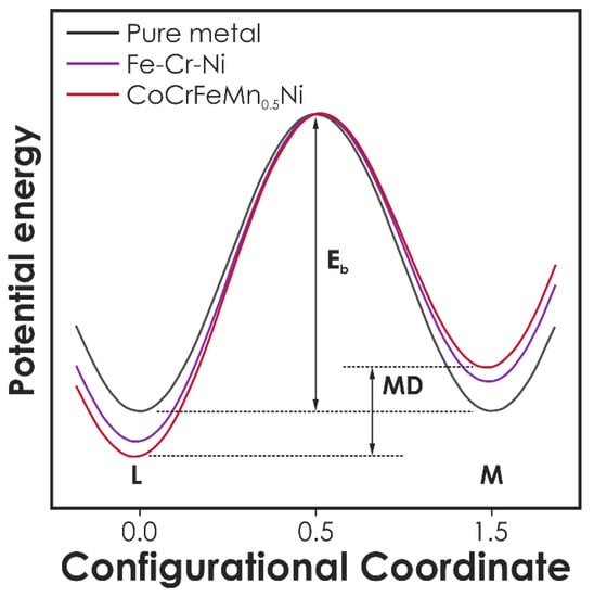 Schematic diagram of the variation of lattice potential energy and mean difference (MD) during the migration of a Ni atom in different matrices (after []). Reprinted from Acta Materialia 61 (2013), Sluggish diffusion in Co–Cr–Fe–Mn–Ni high-entropy alloys, 4887–4897 Copyright 2013, with permission from Elsevier.