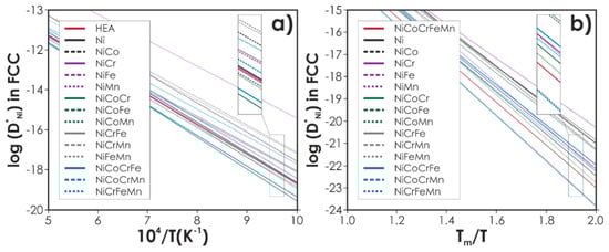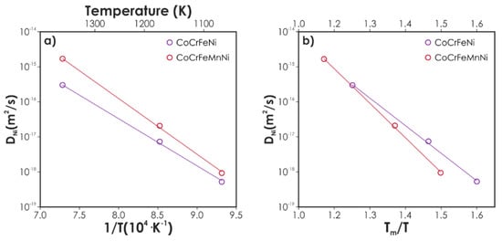 (a) Calculated Ni tracer diffusion coefficients vs. the inverse of the absolute temperature, determined at equimolar ratios, (b) Calculated Ni tracer diffusion coefficients vs. the inverse of the normalized temperature (after []). Reprinted by permission from Springer Nature: Springer, Journal of the Phase Equilibrium and Diffusion, Zhang, C.; Zhang, F.; Jin, K.; Bei, H.; Chen, S.; Cao, W.; Zhu, J.; Lv, D. Understanding of the Elemental Diffusion Behavior in Concentrated Solid Solution Alloys, 2017.