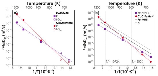 (a) Arrhenius plots of Ni grain boundary (GB) diffusion in CoCrFeNi and CoCrFeMnNi measured in B- (solid symbols) and C-type (open symbols) kinetic regimes. The width of the GB (δ) was taken as 0.5 nm. (b) Comparison of GB diffusivities of Ni in CoCrFeNi, CoCrFeMnNi, with pure Ni and Fe-Ni alloy (after []).