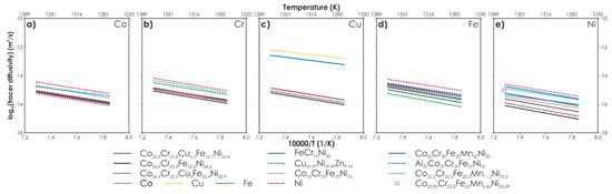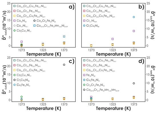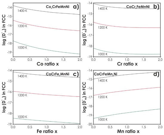 Calculated composition dependence of Ni tracer diffusivities in the Co-Cr-Fe-Mn-Ni system at different temperatures, for different content of considered elements (x) (after []). Reprinted by permission from Springer Nature: Springer, Journal of the Phase Equilibrium and Diffusion, Zhang, C.; Zhang, F.; Jin, K.; Bei, H.; Chen, S.; Cao, W.; Zhu, J.; Lv, D. Understanding of the Elemental Diffusion Behavior in Concentrated Solid Solution Alloys, 2017.