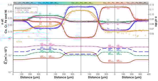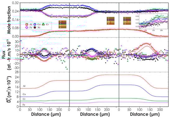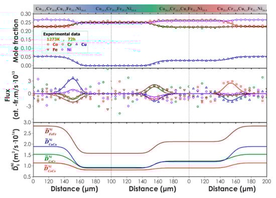 The last article published in the mentioned special issue of the Journal of Phase Equilibria and Diffusion was authored by Chen et al. [] and could be treated as the beginning of the longer series of articles by this team. The authors investigated interdiffusion in Co-Cr-Fe-Mn-Ni alloys using the diffusion multiples experiment (conducted at 1373 K), coupled with the so-called “pragmatic numerical inverse method” []. The applied theoretical description was based on Equations (1), (7) and (8) combined with Manning’s formalisms. The “pragmatic numerical inverse method”, while, in general, similar to the combinatorial approach developed earlier by Kucza [], during the optimization, uses not only concentration profiles but also fluxes. Such an approach may offer some advantages in comparison to the one based strictly on the optimization of concentration profiles as it provides more information, enhancing the probability that as a result of the optimization process, the global minimum is reached. Still, the calculation of fluxes based on the experimental results is always affected by an error; therefore, the usefulness of such an approach is strictly correlated with the quality of the measured concentration profiles, as well as the quality of data processing. Also, another factor that may influence the obtained results is the applied weighting factors between the influence of the concentration profiles error and flux fitting error.
