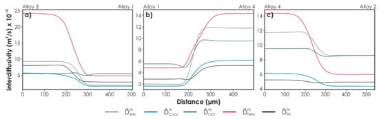 The obtained results, in general, agreed with the observations by other authors. When the Ni was treated as a dependent component, the following sequence of main interdiffusivities was reported: , similar as in the study by Tsai et al. [].