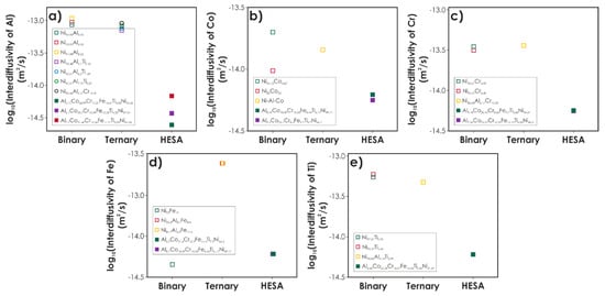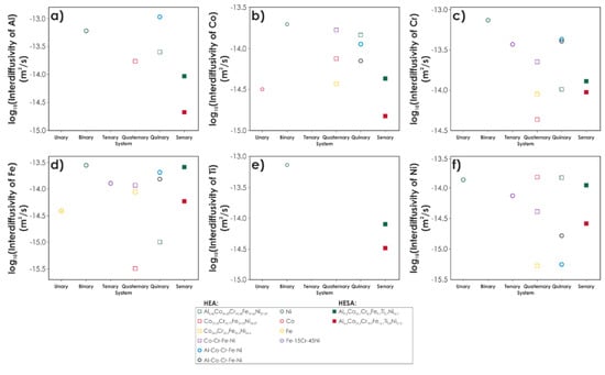 The sequence of the diffusivities from fastest to slowest was similar to the one in the Co-Cr-Fe-Mn-Ni system, namely . The determined values of diffusion coefficients for both considered systems were of a similar order of magnitude, which, in the opinion of the authors, supported the presence of the sluggish diffusion effect. However, the temperature scale normalized with respect to the melting point of the alloys was not considered, making these findings inconclusive.