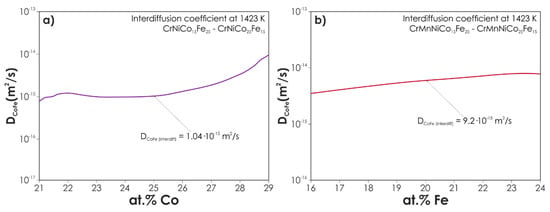 Based on the Arrhenius plots, energies of activation for Ni were calculated for both CoCrFeNi and CoCrFeMnNi. The presence of the crossover temperature was a result of different diffusion behavior of both systems: in CoCrFeNi, the pre-exponential factor, as well as the energy of activation, were relatively low, while the contrary situation was reported for CoCrFeMnNi (see Table 6).