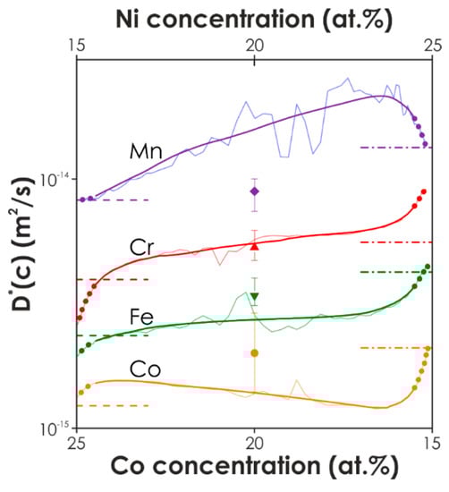 Furthermore, the use of MAA-light formalism allowed calculating the contribution of the correlation factors to total activation energies, with the highest one being determined for Mn (+12.3 kJ∙mol−1). Finally, the authors calculated the values of phenomenological coefficients, showing that in the MAA-light approach, the off-diagonal terms might be significant, reaching up to 31% of the value for diagonal ones.
