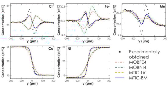 Zhang et al. [] presented a different approach to the topic. The experimental part consisted of two diffusion couple experiments (Co25Cr25Fe25Ni25-Ni50Cr25Fe25 and Co20Cr20Fe20Mn20Ni20-Cr20Fe20Mn20Ni40), but its role was just to allow verification of the theoretical part. This was based entirely on the Calphad approach, with the calculations being conducted using Pandat software combined with the PanHEA database.