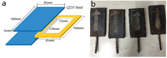 The raw materials were cut into a dimension of 120 mm × 55 mm × 1 mm. The three kinds of metal sheets were degreased in acetone and polished with a diameter of 0.3 mm wire stainless steel brush. Two Ni, Ti sheets, and one Nb sheet were neatly stacked in the order of “Ni-Ti-Nb-Ti-Ni”. The raw materials were placed into a pack (Figure 1a shows the pack size), which was made of Q235 steel and pre-annealed at 800 °C. The pack was sealed by argon arc welding and vacuumed (as shown in Figure 1b).