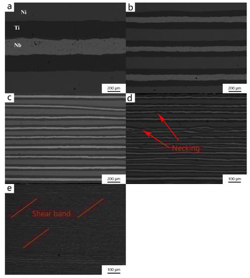 Figure 3 shows the microstructure of the Ni/Ti/Nb multilayer composite on the RD-ND plane during different ARB passes. The three metals were uniformly distributed, and the thickness of layers was gradually reduced in the normal direction. After three passes of the ARB process, the interfaces of layers were relatively straight, and no obvious necking and fracturing appeared. After the fourth pass, the Ni/Ti interface was still straight for the reason that the mechanical properties of Ni and Ti were similar. However, uneven deformation appeared at the Ti/Nb interface and necking occurred in the Ti layer and Nb layer, as the plastic instabilities occurred due to the differences in mechanical and flow properties of layers at the time of the co-deformation of dissimilar metals []. Some shear bands at an angle of 45° to the rolling direction appeared after the fifth pass of the ARB process. Multiple factors led to the formation of the shear bands. Motevalli et al. [] reported that shear bands were formed as a result of the slip system that was activated in the softer matrix, and Qu et al. [] found that such phenomenon was the result of the difference in the flow properties. Moreover, Alizadeh [] indicated that the formation of the shear bonds was due to in-plane shear stress at the interface on the adjacent layers. Similar results were found in other studies on metal composites [,,,,,,,]. These studies indicated that relatively hard metals were prone to local necking and fracturing during the ARB process. As the number of ARB passes increased, hard metals were separated and evenly distributed in soft layers. Uneven deformation occurred locally in layers to cause a change in stress state when the accumulative strain reached a certain level due to the different plastic deformation of dissimilar metals. Generally speaking, the non-uniform interaction between the different layers led to change the heterogeneous structure of the interface, which results in the necking phenomenon and breakdown in the hard layers [].