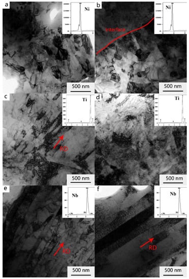 Figure 4e,f, respectively, illustrate the microstructure of the Nb layer after the 3rd and 5th passes. The laminar structure of the Nb layer was observed, and the grains were oriented parallel to the rolling direction. From the third pass to the fifth pass, the laminar structure was always seen in the NB layer. This phenomenon was due to the high recrystallization temperature of Nb, and the ARB process at 500 °C was insufficient for providing the energy required for dynamic recrystallization.