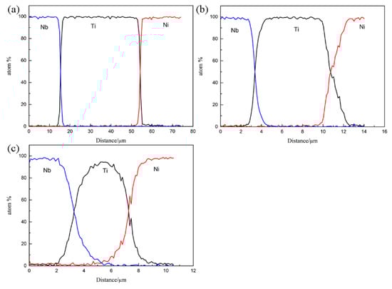 The interface diffusion distance of the Ni/Ti/Nb composite: (a) after the third pass, (b) after the fourth pass, and (c) after the fifth pass.