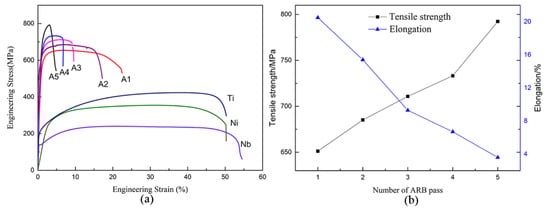 Mechanical properties of the Ni/Ti/Nb multilayer composite: (a) stress-strain curves, (b) variations of tensile strength and elongation versus the number of accumulative roll bonding (ARB) passes.