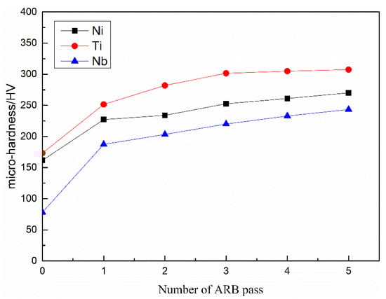 Figure 7 illustrates the variation of average micro-hardness with respect to the number of ARB pass. As the number of the ARB pass increased, the average micro-hardness of layers increased gradually due to the work hardening and grain strengthening. After the first pass, the micro-hardness of the three metals increased rapidly, and the rate of increase decreased in the subsequent process. It was reported that [] the work hardening affected in the initial stage of the ARB process, the effect of improving the micro-hardness was much higher than the later grain refinement. After five passes, the average micro-hardness of Ni, Ti, and Nb increased from 161.8, 173.4, and 78.2 HV to 270.2, 307.4, and 243.4 HV, which increased by 67.0%, 77.3%, and 211.3%, respectively. In the ARB process, the Nb layer kept a laminar structure throughout the process, and no dynamic recovery and recrystallization occurred, so the hardness growth rate of Nb was the highest. Additionally, the micro-hardness growth rate of Ni was the lowest due to the dynamic recovery and recrystallization of Ni.