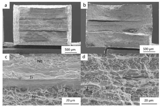 Tensile fracture surfaces of the Ni/Ti/Nb multilayer composite: (a) after the third pass, (b) after the fifth pass, (c) high magnification after the third pass, and (d) high magnification after the fifth pass.