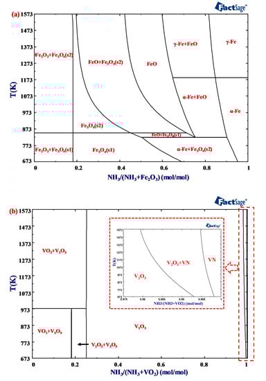 As shown in Figure 1a, the solid phases, including Fe2O3, Fe3O4, FeO and Fe, were mainly dependent on temperature and input NH3 fraction. The condition for the occurrence of Fe was that the temperature was about 823 K and the input NH3 fraction was about 0.5. Thermodynamically, Fe2O3 can be easily reduced even at very low temperature and NH3 fraction. The reaction path of Fe2O3 varied as Fe2O3→Fe3O4→FeO→Fe or Fe2O3→Fe3O4→Fe, which depended on the temperature. It is worthy to note that iron nitride was not observed in Figure 1a under the calculated conditions. As shown in Figure 1b, VO2 can be easily reduced to V2O3 at a temperature above 973 K, regardless of NH3 fraction. When the temperature was lower than 973 K, some V3O5 would have appeared and then been reduced to V2O3. It meant the reaction path of VO2 followed VO2→V2O3→VN or VO2→V3O5→V2O3→VN at a different temperature range. However, the NH3 fraction required for reduction and nitridation of V2O3 was relatively higher, which should be greater than 0.98. Thus, compared with Figure 1a, when Fe2O3 was converted to Fe, VO2 oxide was converted to VN. At the same time, the generated iron can promote the decomposition of ammonia and affect the formation of vanadium nitride [34].