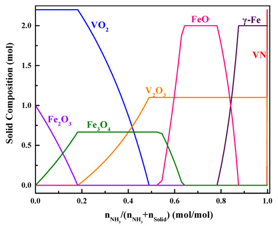 In order to predict the phase composition of NH3–Fe2O3–VO2 system, the solid phase composition as a function of input NH3 mole fraction at 1273 K was calculated. The calculation was carried out at a pressure of 1 bar by fixing Fe2O3 at 1 mol and VO2 at 2.2 mol. The input NH3 mole fraction was given as nNH3/(nNH3+nSolid), where nSolid represents the input mole numbers of Fe2O3 and VO2. The results in Figure 2 show the absolute mole numbers of solid phases during the reaction process. It can be seen from Figure 2 that Fe2O3 undergoes the transformation process of forming Fe step by step. The NH3 fraction required for generating Fe is around 0.78. However, the reduction and nitridation of VO2 to form VN required NH3 fractions to reach above 1, which was much higher than the formation of Fe. It can be seen from Equations (1) and (2) that, at 1273 K, the ΔGΘ of Fe generated by FeO reduction was far less than the ΔGΘ needed for VN formation. From the perspective of thermodynamics, the reaction condition for VN generation was extremely harsh.