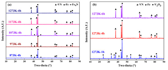 Figure 3a shows the phase composition with temperature in the range of 873–1273 K for 4 h, respectively. As can be seen from the Figure 3a, three different phases, including VN, Fe and Fe4N, existed in the roasted samples. It indicated that VO2 and Fe2O3 have already been completely reduced or nitrided after 4 h. When the reaction temperature was 873 K, VN, Fe and Fe4N were present in the sample. The diffraction peaks were still assigned to VN, Fe and Fe4N with an increase of reaction temperature to 1073 K. However, when the reaction temperature increased to 1173 K, the diffraction peak of Fe4N disappeared. This is because Fe4N is unstable at high temperature and would decompose to Fe and N2. As can be seen from Equations (3) and (4), under standard conditions, the initial temperatures for reactions (3) and (4) are 595 K and 429 K, respectively. It can be deduced that Fe4N is easily converted to Fe under the experimental conditions. Meanwhile, as can be seen from Figure 3a, the relative strength of the diffraction peak of Fe4N was relatively low, which also indicated that Fe4N was unstable in ammonia atmosphere.