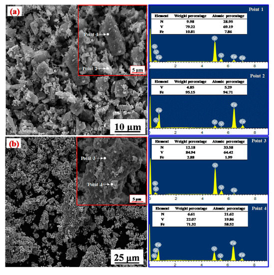 The micromorphologies of the products obtained under different reaction conditions were investigated by scanning electron microscopy (SEM), and the results are plotted in Figure 4. It can be seen from Figure 4a that when reducing at 1073 K for 4 h, the powder particles of the reduced samples were still dispersive. The bright phase and the gray phase were mainly metallic Fe and VN, respectively, and a sintering phenomenon was negligible at 1073 K. The morphology feature of VN was more obvious due to its face centered cubic crystal structure. By reducing at 1273 K for 6 h, the powder particles of the samples accumulated to a larger size and showed an obvious sintering phenomenon, as shown in Figure 4b and the energy dispersive spectrometer (EDS) results of points 3 and 4.