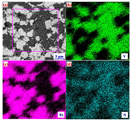 In order to increase the density of ferrovanadium nitride alloy, the obtained powders after reduction and nitridation were pressed into a bulk alloy (cylindrical briquette, 10 mm in diameter, 4 mm in thickness) by hot pressing (HP) at 1473 K for 1 h in vacuum. The density of the FeV45N alloy after sintering was determined as 5.92 g/cm3, which was beneficial to increasing its utilization efficiency during the steel making process. The SEM micrograph and its corresponding area scanning results of the bulk alloy are presented in Figure 5. It can be seen that there were two main phases in the alloy, named metallic iron (Fe) and vanadium nitride (VN), respectively. There was an obvious boundary between the metallic iron and VN phases. The area scanning results also demonstrated that vanadium mainly existed in the form of VN, because the region of vanadium overlapped with that of nitrogen.