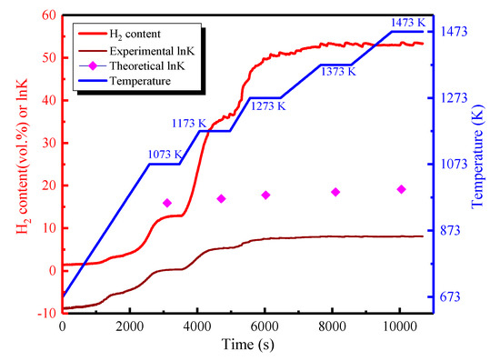 Although synthesizing vanadium nitride by ammonia reduction has been investigated [30,35]. The study by Vaidhyanathan et al. proved that high-purity N2 gas was less effective in the nitridation process than ammonia gas [30]. It is difficult to form vanadium nitride by reacting vanadium oxide with N2 and H2. Thermodynamically, NH3 would easily decompose to form N2 and H2 upon heating. However, the behavior of NH3 was rarely studied, and the components decomposed from ammonia gas were the actual reaction agents which would contact the raw materials. The actual H2 concentration in off-gas was detected by gas analyzer and the results are shown in Figure 6. It can be observed that the H2 concentration increased with an increase in temperature, and it remained almost unchanged after 1373 K. The equilibrium H2 concentration increased from 12.5 vol.% to 53.5 vol.%, which revealed that the pyrolysis of ammonia gas was enhanced by increasing the temperature. However, the experimental pyrolysis ratio was still less than the theoretical value, which can be reflected by lnK. The theoretical and experimental values of lnK can be calculated according to Equations (6) and (7), respectively. The difference in the pyrolysis ratio may be attributed to the kinetic factors. Based on the above results, it can be deduced that ammonia gas was not completely decomposed, even at temperatures above 1373 K, leaving the possibility of reacting by NH3. A wide range of molecular or radical N-containing intermediates of ammonia pyrolysis, such as N, NH, NH2 and N2Hx (x = 1–4) may also be formed for nitridation process [27].