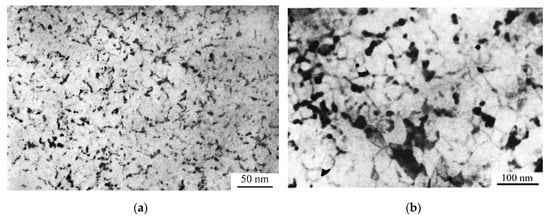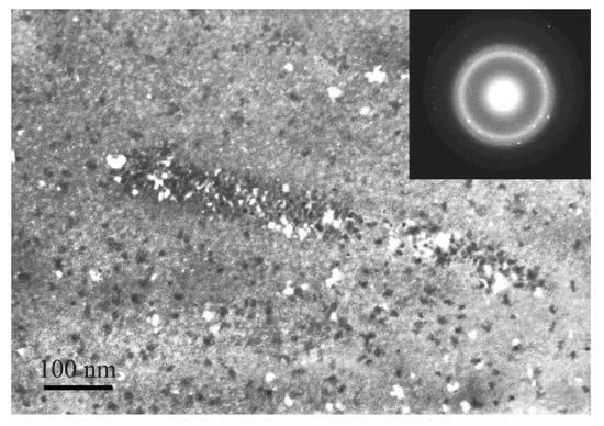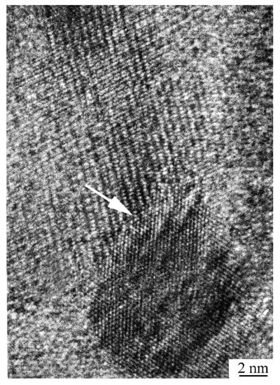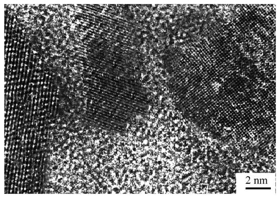 To conclude reliably on the mechanism of nucleation under nanocrystallization, the data on nanocrystal distribution over size under different durations of isothermal exposure and the corresponding analysis of the distribution are required. This issue was studied in most details for alloys of Al86Ni11Yb3 system []. As a result of primary crystallization, a structure is formed in an alloy, which consists of an amorphous matrix containing Al fcc crystals randomly distributed over it. Al fcc crystals have a size of several nanometers. An example of this structure is shown in Figure 5. Al nanocrystals are generally isolated by the amorphous matrix from each other.