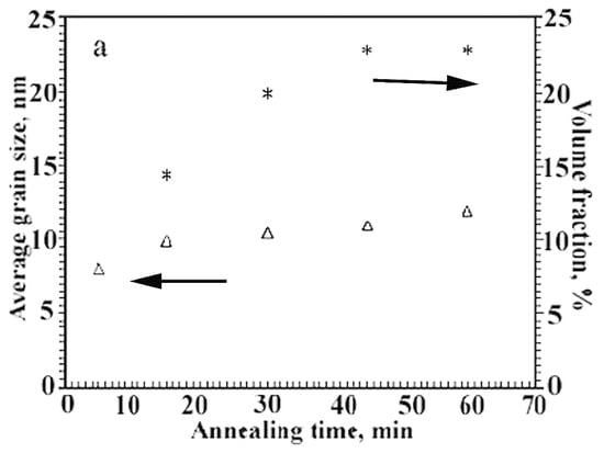 Dependence of an average nanocrystal size (triangles) and fraction of the nanocrystals (asterisks) on the duration of annealing at 473 K for Al86Ni11Yb3 sample [] [reproduced from Physics of The Solid State 2001, 43, 2003 with permission from Pleiadis Publishing, 2020].