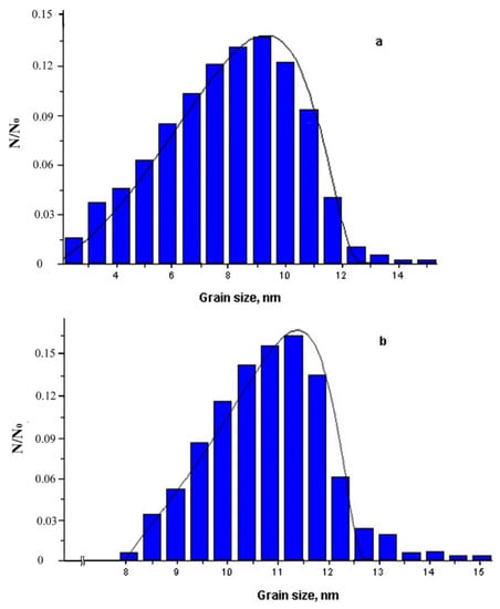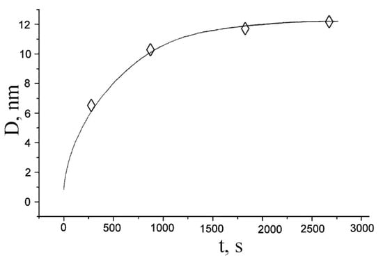 This time dependence of the crystal size results in that nanocrystal distribution over size in the case of heterogeneous nucleation becomes narrower with time. Thus, for the distribution shown in Figure 7a the dispersion was 15.76 nm2, and for that presented in Figure 7b it was 4.96 nm2. In principle, the Ostwald coalescence described by the Lifshitz–Slyozov theory [] can also lead to narrowing of the histograms of nanocrystal distribution over size and shift it.