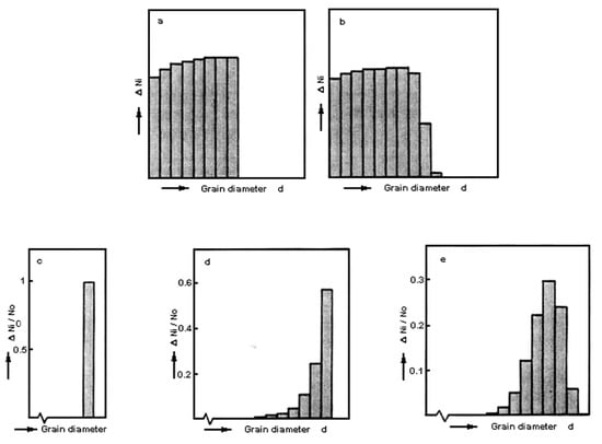 Histograms of the grain distribution over size for (a,b) homogeneous and (c,d,e) heterogeneous nucleation; (b,e) cases of nonstationary nucleation []. [reproduced from Physics of The Solid State 2001, 43, 2003 with permission from Pleiadis Publishing, 2020].