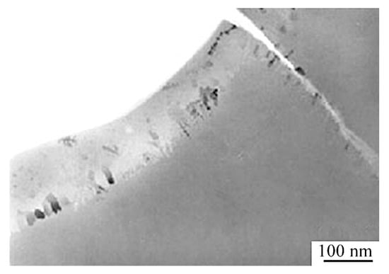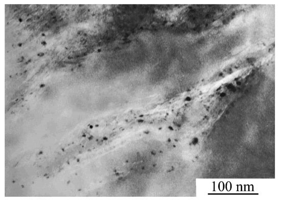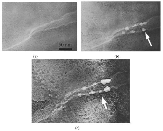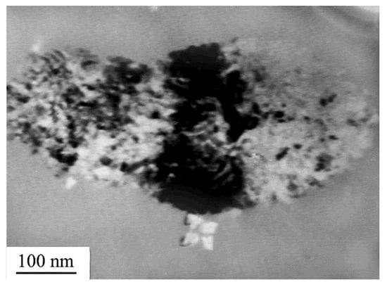The irradiation of amorphous alloys, for example, by fast neutrons, can also lead to the formation of an inhomogeneous amorphous structure consisting of regions and different short-range orders. When the amorphous Pd80Si20 alloy was irradiated with fast neutrons with a dose of 5 × 1020 neutrons/cm2, the formation of structural inhomogeneities was observed, which are clusters with increased electron density, surrounded by boundary regions with a reduced electron density. The diameter of the clusters together with the shell was 10–20 Å []. Irradiation can lead not only to the formation of inhomogeneities, but also to their reduction. For example, amorphous alloys (Mo60Ru40)82B18 and Fe40Ni40P14B6 became brittle after isothermal annealing, which is associated with the formation of inhomogeneities. After irradiation, the plasticity returned to its original value.