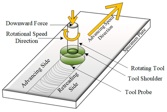Friction stir processing (FSP) is a solid-state surface treatment technique in which the tool’s pin is inserted inside the material for processing. FSP is the modification of friction stir welding (FSW) and used to modify the behavior of the material, whereas FSW is used for the joining of metals. The side of the workpiece, where the processing direction and direction of rotational velocity are the same, is the advancing side (AS) and the other side, where the processing direction and direction of rotational speed are opposite, is the retreating side (RS) as shown in Figure 1 [3]. During FSP, severe plastic deformation takes place and a tool mechanically stirs the material to modify its microstructure by refinement of the microstructure through dynamic recrystallization [3]. Refinement of the microstructure affects properties like the strength, hardness, fatigue behavior, and corrosion resistance of the SDSS. Therefore, FSP has influence on the properties of the material [4] and, more specifically, strength and fracture toughness are expected to be enhanced.