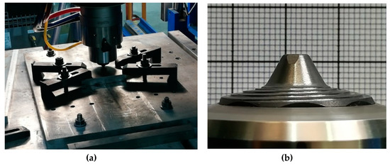 FSP was performed using a research base friction stir welder RM-1 ((Manufacturing Technology. Inc., Indianapolis, IN, USA), which was equipped with the necessary sensors and a data acquisition system for measuring tool reaction loads and other parameters including, but not limited to, rotational and welding speeds, plunging depth, etc. The machine was computer numerical controlled (CNC) and had the capability to perform FSW under position and force control. The machine forging capacity was limited to 65 kN, which is applicable for processing steel and stainless steel. A water-cooled tool holder (Megastir, Provo, UT, USA), shown in Figure 2a, was used to hold and drive the PCBN tool Q70 (Megastir, Provo, UT, USA), shown in Figure 2b, having a 25 mm shoulder diameter and 5.2 mm tapered pin length.
