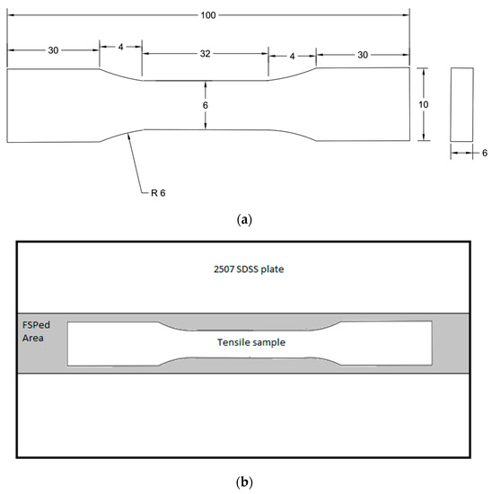 Tensile testing of the base and FSPed samples was carried out on an Instron Machine 8801 (INSTRON, Norwood, MA, USA), that is used for dynamic and static testing, having a load capacity of 100 kN according to ASTM standard E8/E8M-16a [20]. Sub-size tensile sample dimensions, shown in Figure 3a, were cut along the processing direction, where the whole length of the specimen was in the processed region to exclude the effect of Heat Affected Zone (HAZ) on the processed material strength. Figure 3b illustrates the way samples were extracted from the process zone. Three tensile tests were performed on each BM and FSPed samples at a loading rate of 1 mm/min. Strain was measured using an axial extensometer until a strain value of 20% was reached.
