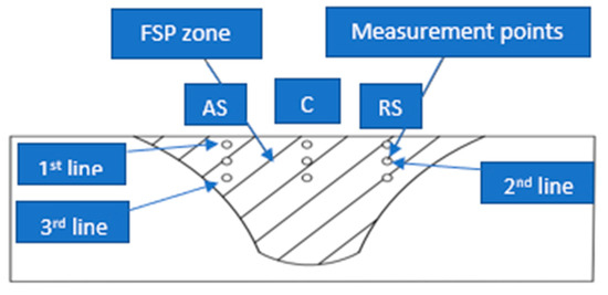 Microhardness measurement points in the stir zone (SZ).