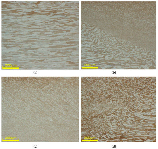 Figure 8 shows the microstructure of the processed region and Figure 9a,b details the changes in the microstructure at different points (a, b, c, d) from the base material to the processed zone. The images shown in Figure 9 were taken at the same magnification of 277x throughout the processing section along the cross section of the FSPed region. It can be seen in Figure 8 and Figure 9b that there was a sharp boundary created by a sudden decrease in both austenite and ferrite grain sizes from the BM to the SZ on the AS., whereas on the RS the grain size reduced gradually from the BM to the SZ, as shown in Figure 9d. On the AS the direction of the rotational velocity vector and advancing velocity vector are in the same direction but on the RS, they are in opposite directions [22], resulting in higher net force on the AS. Thus, the grains on the AS experienced more plastic deformation/strain compared to the grains on the RS. This caused a sharp boundary on the AS and the gradual increase in grain size from the AS to the RS in the SZ. Additionally, peak temperature were different due to a difference in the plastic strain in the SZ [23]. The observed asymmetry in grain size, with respect to processing weld size, was mainly due to this difference in plastic strains and temperatures from the AS to the RS. This observation is in agreement with the findings of Seidel and Reynolds [24]. Mishra et al. [10], who also concluded that the asymmetry of the SZ can be attributed to the variation in plastic strain and temperature.
