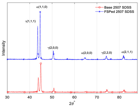 During FSP, the peak temperature was measured by an infrared camera to be between 800 and 1000 °C. The sigma phase usually forms between temperature range of 700–900 °C in DSS [25]. The sigma phase is a brittle and hard phase that affects the mechanical behavior of the material [26]. XRD was performed to observe the possible formation of the sigma phase (Figure 10). The XRD pattern of FSPed sample did not show any new peaks, thus the sigma phase was not produced during FSP. Similar findings were obtained by Li et al. [27] for FSPed hyper DSS, who explained that the sigma phase was not formed because it needs more time to form at a temperature range of 700–900 °C. Sato et al. [28] revealed that around 52 min were required at a temperature of 827 °C for sigma phase formation in FSW of DSS, while Elmer et al. [29] found that 3.0 min were required at a temperature of 850 °C for formation of around 1% sigma phase during FSW of 2205 SDSS. Cui et al. [30] showed that the cooling rate was around 75 °C/s for the carbon steels that were processed at a 100 mm/min of welding speed. It may be concluded that the absence of the sigma phase in the present process was due to the high cooling rate.