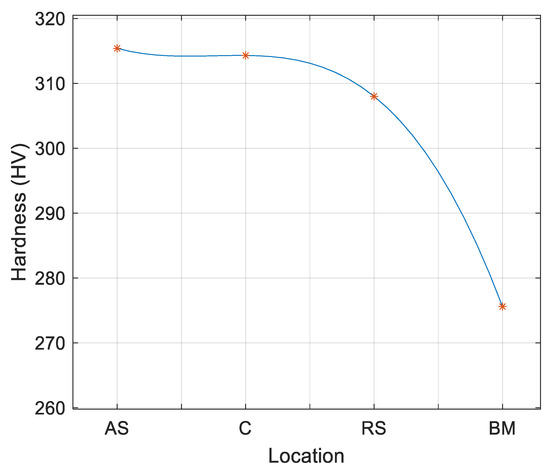 The microhardness measurement results are reported in Table 4 and the variation of the average values of the microhardness is illustrated in Figure 13. It can be observed in Figure 13 that the hardness increased in the SZ from RS to AS because grain size reduced from RS to AS. The increase in the hardness in the SZ was not uniform and this behavior was because of the non-uniformity of grain size in the SZ. The average hardness improvement in RS is about 12% while that in AS is more than 14%.