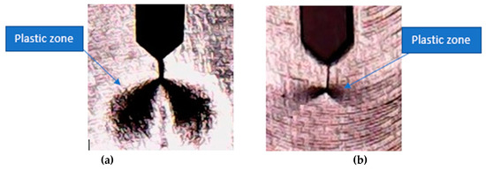 It can be seen from Figure 14 and the results of Table 5 that the fracture toughness of FSPed samples improved to that of the BM by an average close to 12%. This was mainly due to the presence of a larger number of grain boundaries and a smaller plastic zone size which increased the resistance against crack growth. It can be seen in Figure 15 that FSPed material had a smaller plastic zone than the BM. The plastic zone is the region where plastic deformation occurs [38]. FSP reduced the plasticity of the material because a significant number of grain boundaries hindered the dislocation motion more, as discussed in [32], and also the BM had a lower yield stress, and a lower yield stress material has a larger plastic zone than the material of high yield stress [38,39]. This caused a smaller plastic zone in the FSPed material. Therefore, a smaller plastic zone and a significant number of grain boundaries improved the fracture toughness of 2507 SDSS. It can also be noted in Figure 15b that, for the friction stir processed specimen, the crack initiated at the sharp V-notch and propagated in the middle of the stir zone.