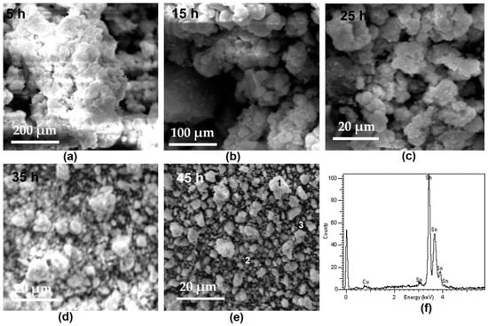 SEM micrograph of Sn-0.7Cu alloy milled for various times. (a) 5 h, (b) 15 h, (c) 25 h, (d) 35 h, (e) 45 h, and (f) energy-dispersive X-ray spectroscopy (EDS) analysis.