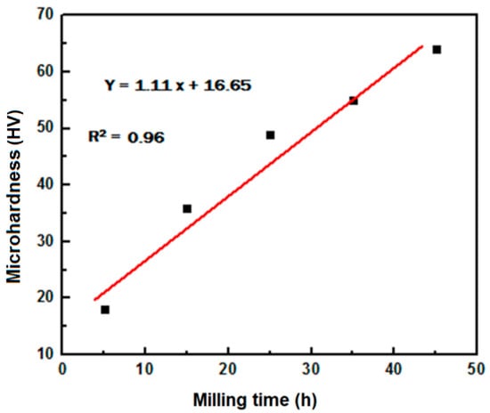 The microhardness of the samples for various milling times is shown in Figure 3. The microhardness of the Sn-0.7Cu alloy increased with milling time, reaching its maximum value at 45 h. The increase in the microhardness value was mainly related to the stored strain energy, as well as a decrease in crystallite size as already discussed. In the observed alloying process, the microhardness showed a linear dependence on the milling time.