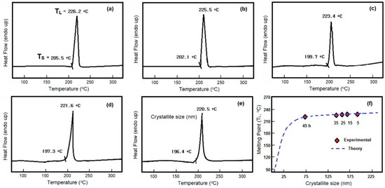 The solidus temperature (TS) decreased down to 196.4 °C after milling for 45 h (Figure 4a–e). It is already shown that the milling induced crystal refinement and raised the stored energy, which lowered the Gibbs free energy and created a noted depression in the melting point [26,27]. The various melting temperatures (liquidus (TL), solidus (TS), pasty range (TL–TS)) and enthalpy are shown in Table 4.