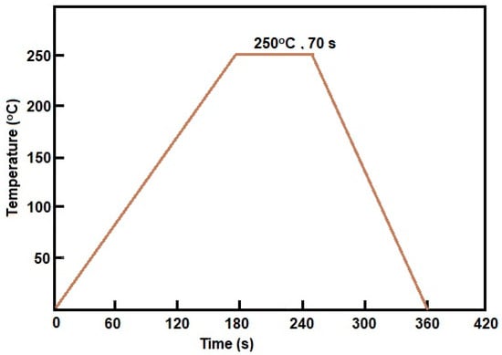 The wetting of the milled powders was calculated by the area spread ratio technique. The milled Sn-0.7Cu powders were reflowed over the metallic Cu substrates at 250 °C for 70 s. The reflow profile adopted for the spread ratio measurements is shown in Figure 5.