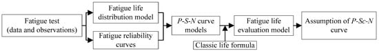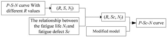 As discussed above, the new fatigue life evaluation model can reasonably and quantitatively describe the relationship between fatigue cracking and fatigue life in a general condition (that is, the condition of reliability R = 0.5). The fatigue life model with R = 0.5 can satisfy most of application requirements of general practical engineering, just as the commonly used S-N curve represents a P-S-N curve with a reliability of 0.5, which can be applied in most cases. But P-S-N curves with other reliability values are still required to produce a comprehensive reliability analysis for FV520B-I in the VHCF regime. Thus, it is also necessary to improve the application range of the new fatigue life evaluation model by establishing fatigue life evaluation models with different reliability values, especially for some critical situations like R = 0.1 and R = 0.9. Based on the above points and requirements, a new comprehensive assumption is proposed to describe the relationship between fatigue reliability, fatigue cracking and fatigue life (that is, the P-Sc-N curve). The proposed P-Sc-N curve can improve the accuracy of the fatigue reliability analysis by considering the influence of fatigue cracking on fatigue failure, and it is also beneficial to the design of procedures in re-manufacturing engineering under the material fatigue failure control. The logical relationship between fatigue reliability, fatigue crack and fatigue life can be expressed as Figure 11: