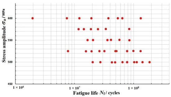 Furthermore, at least three groups of test data with different stress amplitudes are required, from 500 MPa to 600 MPa, as employed in the fatigue test. Adequate amounts of test data are required to ensure the accuracy of estimation results. The fatigue results in Figure 3 include the fatigue life with five different stress amplitude values; most of the test data are in the very-high cycle fatigue regime, which means the test data are sufficient for the estimation of the unknown model parameters.