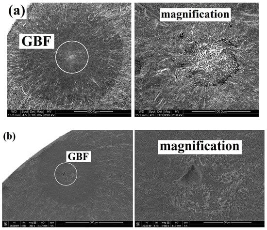 Several fatigue test phenomena of FV520B-I have been observed with the application of scanning electron microscopy (SEM), such as Granular Bright Facet (GBF) (JEOL Ltd, Tokyo, Japan) and “fish-eye”. Shiozawa [,,] and Murakami [,,] focused on the study of VHCF failure mechanisms. It was proposed that primary crack initiation sites are around the subsurface crack: during the fatigue process, some cracks form in the GBF and continue propagating to “fish-eye” until failure. These two fracture features are prominent characteristics of VHCF failures of metallic materials.