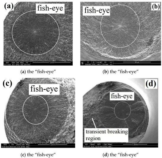 Except in the GBF region, from the fracture surface of the specimen, the “fish-eye” boundary can be clearly observed as shown in Figure 5. “Fish-eye” is the most significant characteristic of very-high cycle fatigue fracture, and the change of the crack propagation rate during the crack propagation process leads to the formation of “fish-eye.”