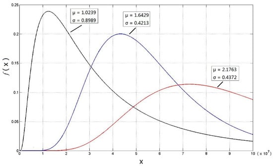 Based on the test results, as shown in Figure 2, the fatigue life distribution of FV520B-I in the VHCF regime with different stress amplitudes can be estimated. The logarithmic normal distribution model has been widely used to quantitatively analyze the reliability of various mechanical parts for its numerous advantages: a simple calculation process, high accuracy, and wide applicability. Logarithmic normal distribution is employed as the base model in this paper to obtain the fatigue life distribution of FV520B-I in the VHCF regime. The fatigue life probability density function [] of the logarithmic normal distribution is written as: