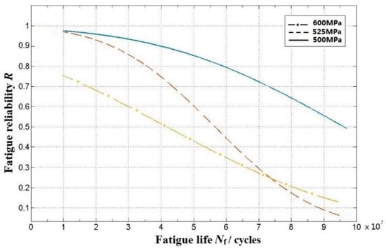 Fatigue reliability curves based on the logarithmic normal distribution model are obtained according to Equation (5), as shown in Figure 7. A negative correlation between fatigue reliability and fatigue life can be clearly detected: with the increased fatigue life, reliability without failure decreases.