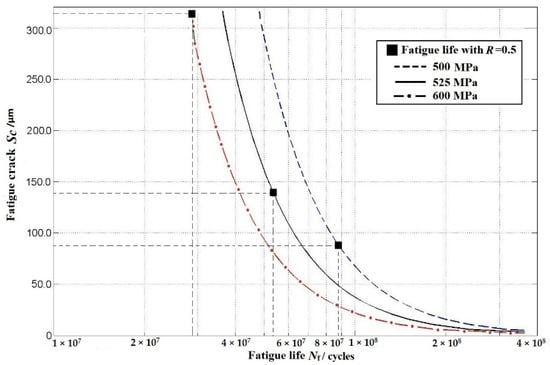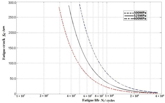 In order to keep the same stress amplitude conditions in the derivation process of the P-S-N curve model of FV520B-I, stress amplitudes of 600 MPa, 525 MPa and 500 MPa were employed. The quantitative relationship curves between fatigue crack and fatigue life with 600 MPa, 525 MPa and 500 MPa were drawn in Figure 9, based on Equation (12).