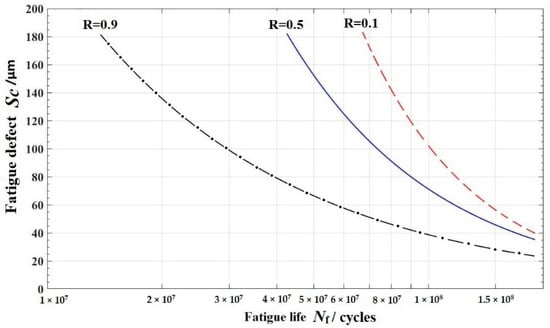The fatigue life of FV520B-I in VHCF regime is employed as the transition variable of to integrate the reliability and crack into one united model. Thus, the first step in the development of this new model is to determine the fatigue life of FV520B-I. Zhang [] proposed an specific very-high cycle fatigue life model for FV520B-I, as displayed in Equation (12)